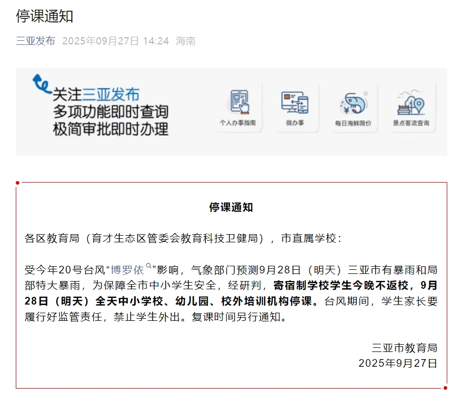 新京报讯 据三亚发布消息,受今年20号台风“博罗依”影响,气象部门预测9月28日(明天)三亚市有暴雨和局部特大暴雨,为保障全市中小学生安全,经研判鼎际之家,寄宿制学校学生今晚不返校,9月28日(明天)全天中小学校、幼儿园、校外培训机构停课。台风期间,学生家长要履行好监管责任,禁止学生外出。复课时间另行通知。