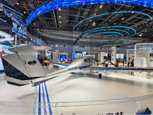 走进今年首次设立的数智中东欧区块,映入眼帘的是万丰钻石HEMEP混合动力多引擎飞机。该款飞机是全球首款多发混合动力飞机,由奥地利钻石飞机公司研发,后者已被中国企业万丰集团全资收购。