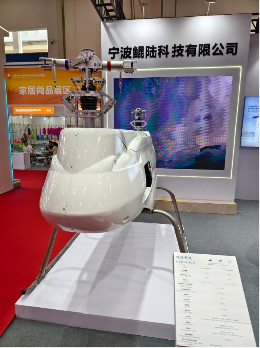 宁波鲲陆科技有限公司为本届博览会带来了纵列式重载无人直升机。据介绍,该公司的重载无人直升机广泛应用于物流运输、地质勘探、应急消防、农林植物保护等多个领域,助力各行业提高运营效率和安全性。