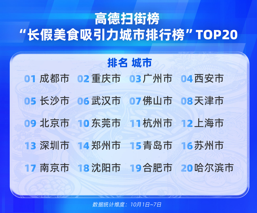 “好玩又好吃”成为广大游客出行决策的新标准亚晶金融,“美食+美景”让更多人愿意去、待得住。高德扫街榜数据显示,全国《长假美食吸引力城市排行榜》的前20名依次是:成都、重庆、广州、西安、长沙、武汉、佛山、天津、北京、东莞、杭州、上海、深圳、郑州、青岛、苏州、南京、沈阳、合肥、哈尔滨。
