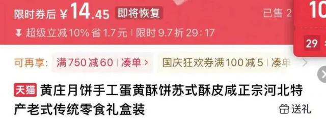 当一些人在一边艰难服用 198 元一盒的"低糖轻奢月饼",268 的"黑松露礼盒月饼"时,黄庄月饼已经用零头价格给了我们"庄门人"一点点安慰: